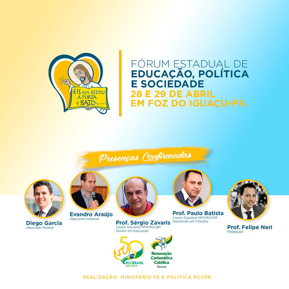O Ministério de Fé e Política da Renovação Carismática Católica do Estado do Paraná, promove nos dias 28 e 29 de abril de 2018, nas dependências do Hotel Bella Itália no município de Foz do Iguaçu, o “Fórum de Educação, Política e Sociedade” com objetivo de refletir os temas centrais do fórum a luz do pensamento Social da Igreja.